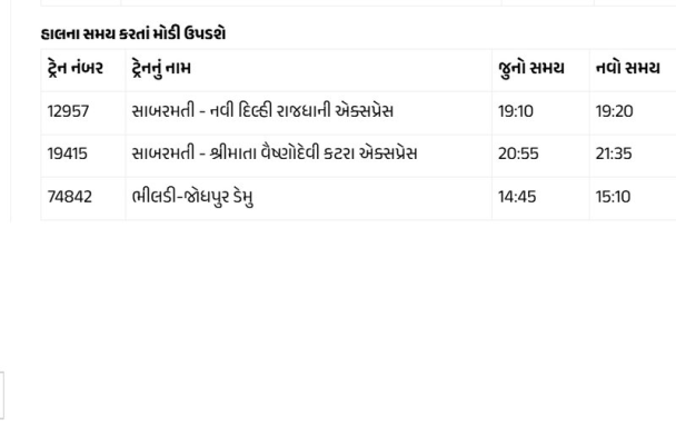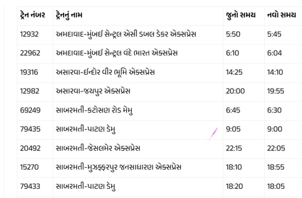 આ સમય ફેરફારની અસર અમદાવાદના કાલુપુર મુખ્ય રેલવે સ્ટેશન ઉપરાંત સાબરમતી, મહેસાણા, પાલનપુર, પાટણ, ભીલડી, ઊંઝા, સિદ્ધપુર, ગાંધીનગર, કલોલ, વિરમગામ, ગાંધીધામ, હિંમતનગર, હળવદ, ધ્રાંગધ્રા, સામખિયાળી અને ભુજ સહિતના સ્ટેશનો પર થશે. પશ્ચિમ રેલવેએ કુલ 89 ટ્રેનની ગતિમાં 5 કિમીથી લઈને 66 કિમી પ્રતિ કલાક સુધીનો વધારો કર્યો છે.