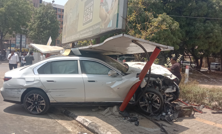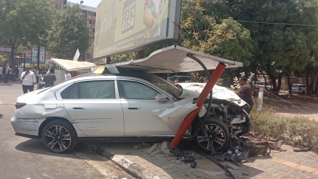 અમદાવાદના નિકોલમાં બેફામ BMW ચાલકે AMTS બસ સ્ટેન્ડને મારી ટક્કર અને રિક્ષાને ફંગોળી